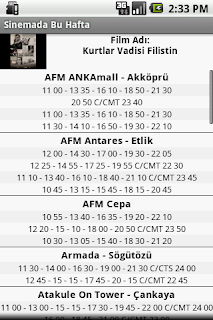 Gösterimde (vizyonda) olan filmler hakkında bilgi veren ve seans bilgilerini gösteren bir uygulama.Türkiye'deki tüm şehirlerdeki sinemaları ve seans bilgilerini gösterir.Seans bilgisine uzun basılı tuttuğunuzda seans bilgilerini email vs... ile paylaşmanızı sağlar.Samsung galaxy s telefonunda test edilmiştir.Lütfen uygulamayı kurduktan sonra yorumlarınızı belirtiniz.
