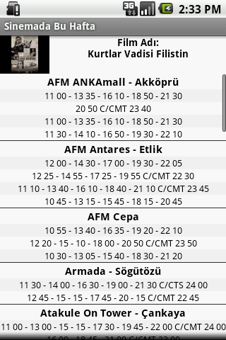 Gösterimde (vizyonda) olan filmler hakkında bilgi veren ve seans bilgilerini gösteren bir uygulama.Türkiye'deki tüm şehirlerdeki sinemaları ve seans bilgilerini gösterir.Seans bilgisine uzun basılı tuttuğunuzda seans bilgilerini email vs... ile paylaşmanızı sağlar.Samsung galaxy s telefonunda test edilmiştir.Lütfen uygulamayı kurduktan sonra yorumlarınızı belirtiniz.